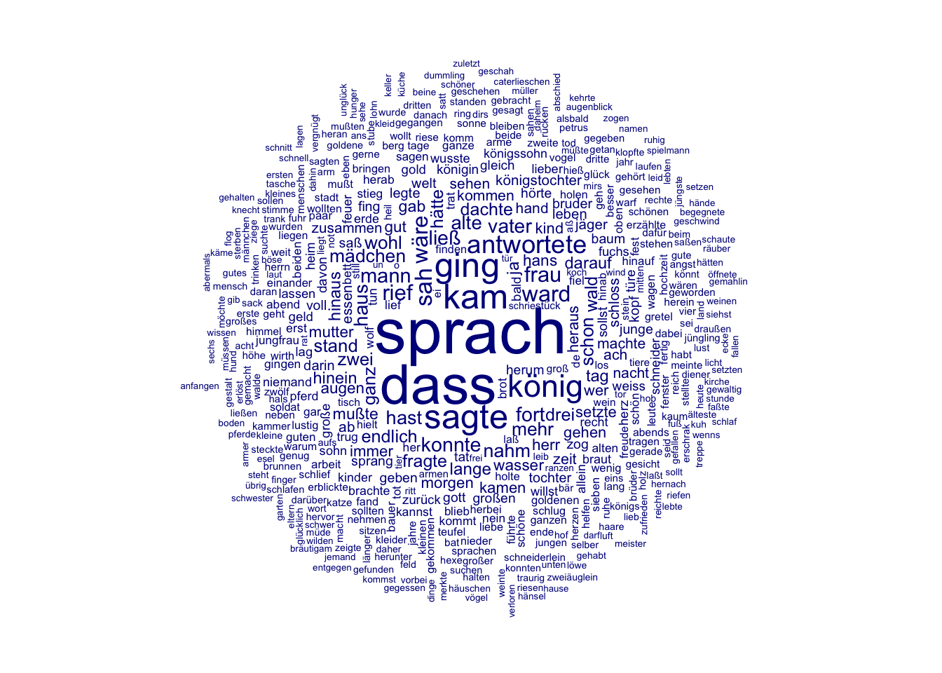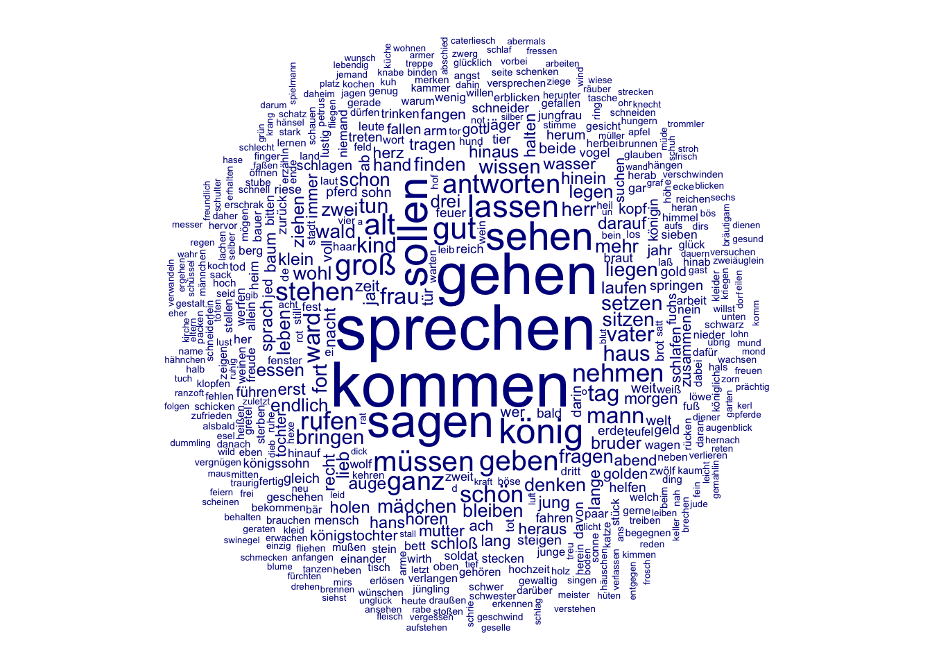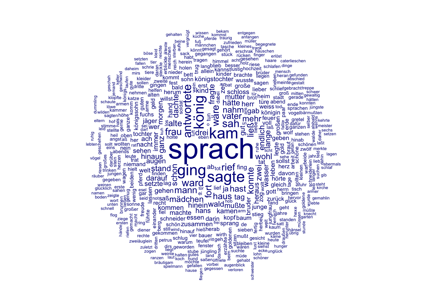 In den nächsten beiden Wochen werden wir ein Korpus von Kinder- und Hausmärchen der Gebrüder Grimm aus dem Jahr 1857 im Hinblick auf die Darstellung verschiedener Märchencharaktere untersuchen. Dabei werden wir verschiedene Analysemethoden kennenlernen und kritisch beleuchten, inwieweit diese Methoden uns helfen können, bestimmte Muster in der Beschreibung von Märchencharakteren zu identifizieren. In diesem Kapitel werden wir zunächst Worthäufigkeiten und das gemeinsame Vorkommen verschiedener Wörter unabhängig von der Beziehung der Wörter zueinander betrachten. Wir werden dabei kritisch beleuchten, was die vorgestellten Analysemethoden leisten können und was nicht. Im Kapitel 9 werden wir dann konkreten Fragen nachgehen: Welche Charaktere kommen in den Märchen vor? Mit welchen Adjektiven werden diese beschrieben? Welche Verben werden mit ihnen assoziiert?