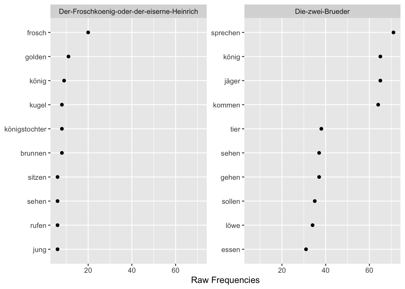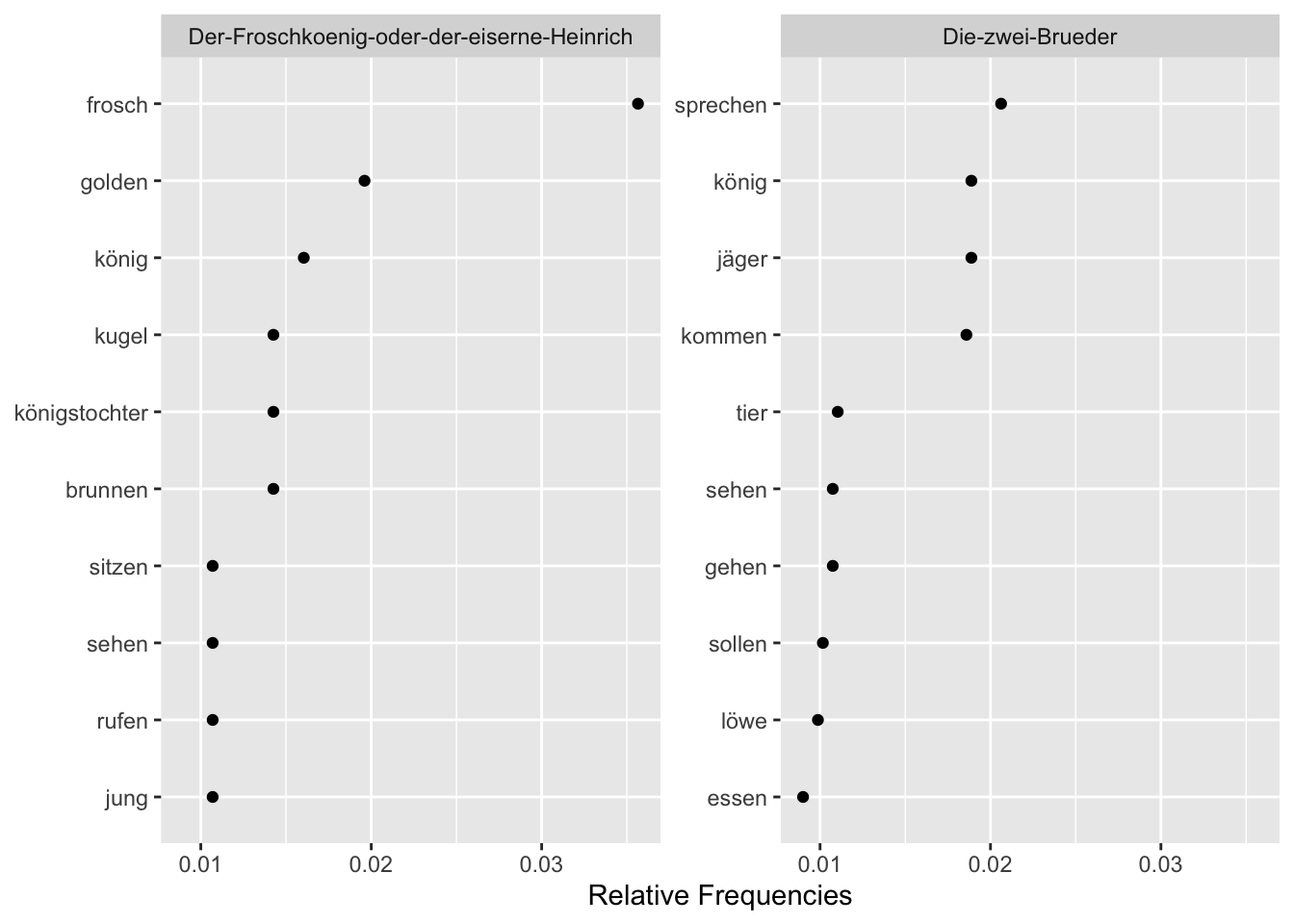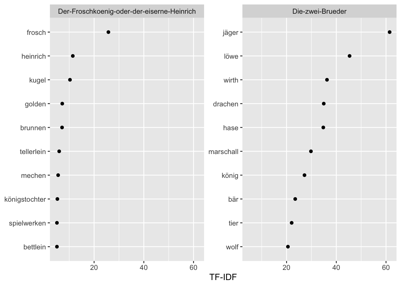 tstat_freq_tfidf_subset <- tstat_freq_tfidf[tstat_freq_tfidf$group %in% c("Die-zwei-Brueder", "Der-Froschkoenig-oder-der-eiserne-Heinrich"), ]