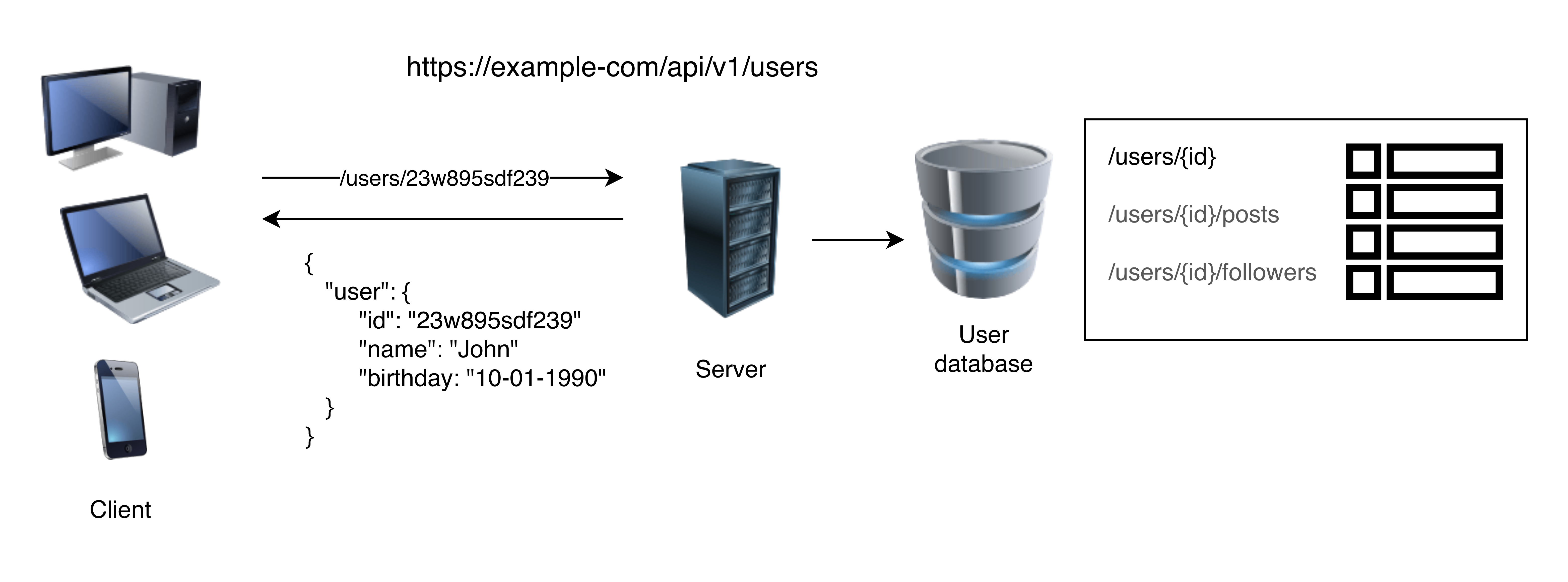 Ein Unternehmen kann zum Beispiel über eine öffentliche API mithilfe verschiedener URIs verschiedene Arten von Daten bereitstellen. Im Beispiel unten wird eine Auflistung aller alle Nutzer:innen eines sozialen Netzwerks im JSON-Format als Antwort auf die HTTP-Anfrage zurückgegeben, aber es sind auch zwei weitere Endpunkte abgebildet: Eine Auflistung aller Posts der Nutzer:innen sowie Daten zu deren Follower:innen.