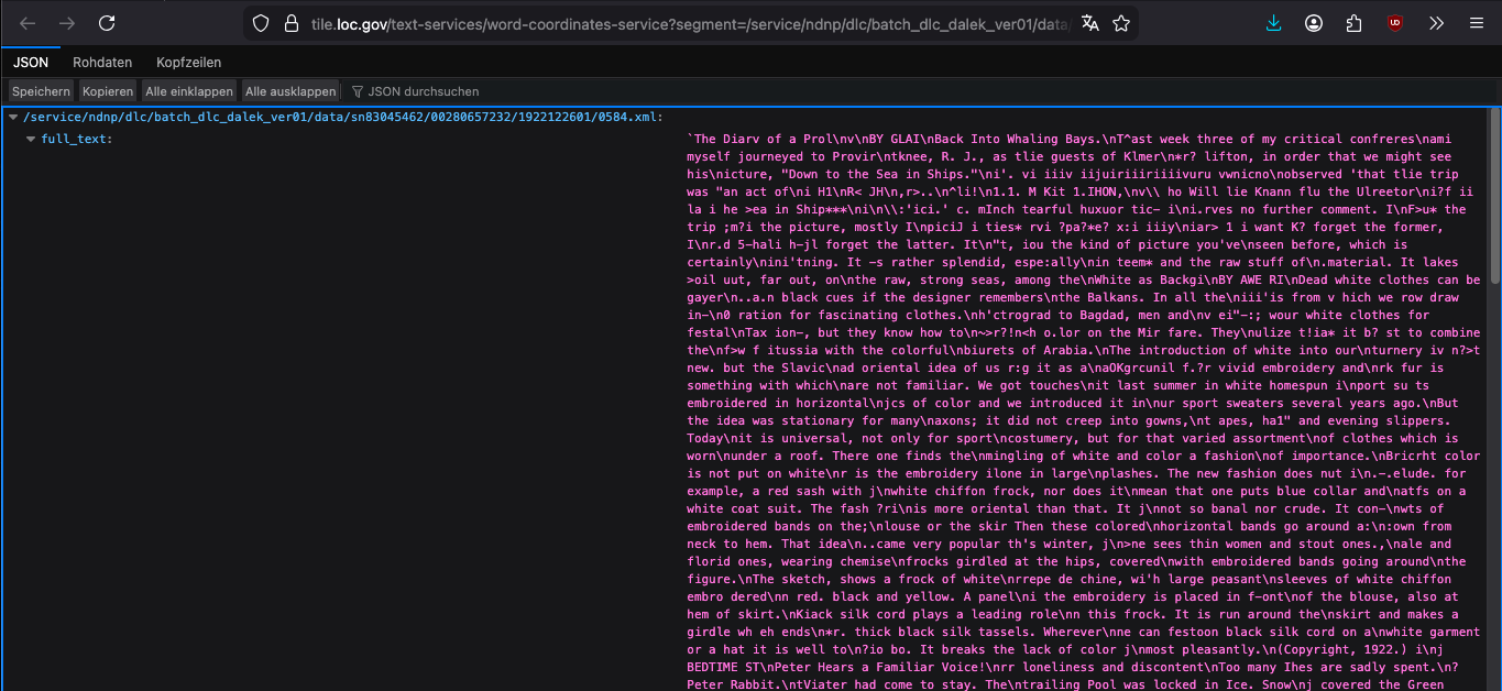 Ein Klick auf die unter “fulltext_file” verlinkte Ressource öffnet ein weiteres JSON-Dokument, das den eigentlichen Volltext enthält: