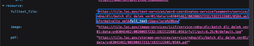 Note: If you’re looking to download full text from the newspaper pages in a given search result, note that the full text (from OCR) is captured for each page within the “full_text” JSON field. For example: https://www.loc.gov/resource/sn83045462/1922-12-26/ed-1/?sp=22&q=clara+bow&fo=json