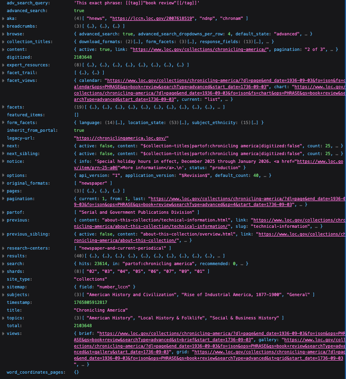 Dokumentation zur Chronicling America API: https://libraryofcongress.github.io/data-exploration/loc.gov JSON API/Chronicling_America/README.html