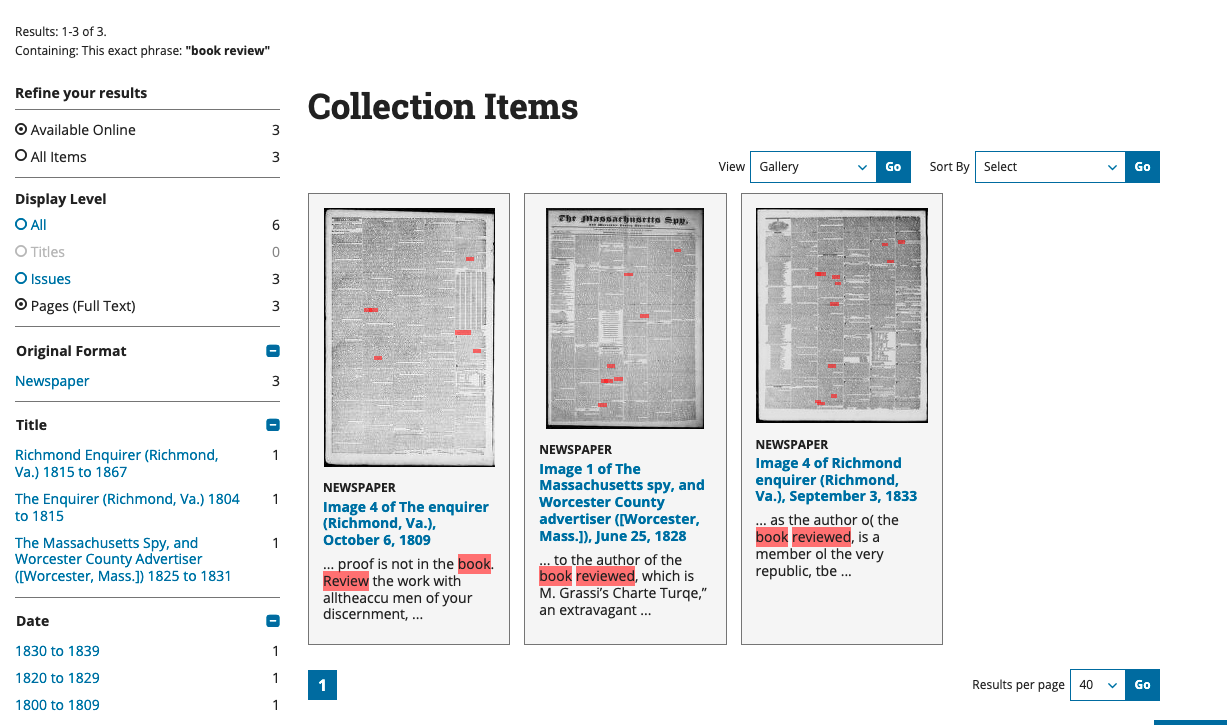 Die Suche liefert drei Ergebnisse und vor allem eine wichtige Information zum Verhalten der Volltextsuche: Es wird nicht nur die exakte Wortkombination “book review” gefunden, sondern auch Wortkombinationen über Satzgrenzen hinweg wie “book. Review” und Wortkombinationen, in denen die Suchbegriffe vorkommen wie “book reviewed”. Auch das ist zur Einschätzung der Vollständigkeit und Qualität der extrahierten Daten wichtig.